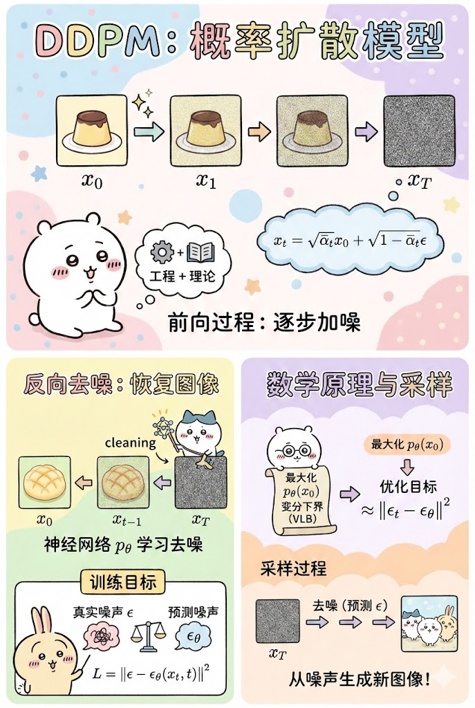反向过程 (Reverse Process) : 训练神经网络 学习去噪,从纯噪声 逐步恢复出原始图像